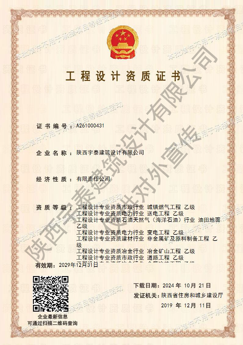 • 熱烈祝賀陜西宇泰建筑設(shè)計有限公司工程設(shè)計資..